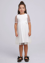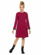 Платье для девочек. Новинка кроя! Платье из эластичного футера, силуэт-трапеция: в верхней части более прилегающее, к низу более расширенное. Облегающие рукава вверху, расширяются к низу; по низу рукавов плиссированная сетка с настроченной бархатной лентой и бантиком; декоративный центральный шов по переду изделия.