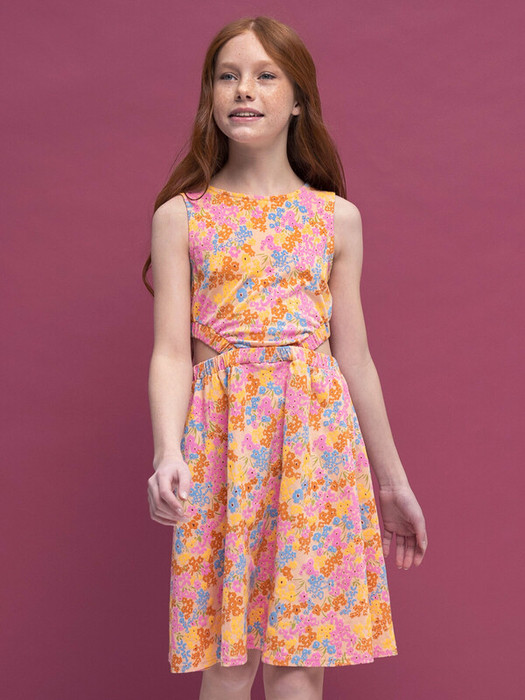 Летнее приталенное платье оригинального кроя для девочки. Имитация комплекта из модного кроп-топа с округлым вырезом горловины и юбки на резинке. Верхняя часть изделия и юбка соединены только по переду, поэтому спинка немного открыта. 100% хлопка в составе ткани — модель приятна на ощупь и очень комфортна для жары. Крой юбки — полусолнце, поэтому она не сковывает движений. Платье декорировано нежным цветочным принтом. Отличный выбор для летнего отдыха и прогулок.