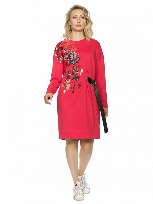 Новинка! Женское платье-свитшот из пластичного футера с ассиметричной деталью - поясом из тесьмы с деликатным вкраплением люрекса. Объемный современный силуэт, спущенная линия плеча, широкие манжеты на рукавах и понизу изделия. Стойкий принт с переливами разноцветного золота. Перевод: Все происходит по какой-то причине.