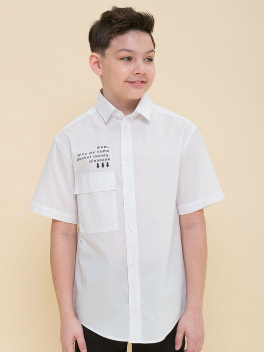 Школьная рубашка свободного силуэта для мальчика. В составе ткани преобладает хлопок — модель мягкая, приятная на ощупь и пропускает воздух. Полиэстер помогает не терять форму и превосходный внешний вид. По спинке кокетка с двумя защипами для свободы движения. Накладной карман с клапаном — актуальный модный тренд. Над карманом изделие украшает забавный принт, мягкий и устойчивый к частым стиркам. Перевод: «Мама, положи в мой карман деньги, пожааалуйста». Рубашка отлично сочетается с различными брюками, пиджаками, жилетами и подходит мальчикам с разными типами фигуры. Модный и практичный вариант школьной сорочки для мальчика.