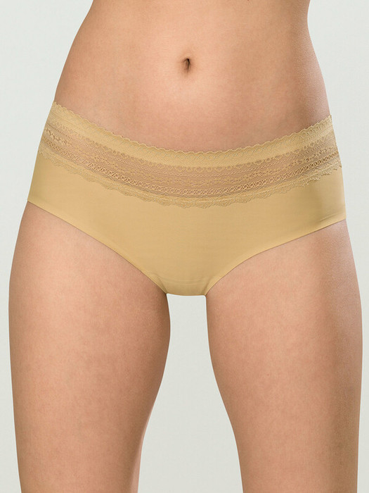 Женские трусы-шорты с низкой посадкой. Изготовлены по бесшовной технологии с минимум швов. Кромки по ноге и по талии подогнуты и приклеены, хлопковая приклеенная ластовица.  Нежное геометричное кружево по линии талии высотой 5 см – не передавливает тело и не натирает кожу.  Модель оценят те, кто ищет незаметное и невесомое белье на каждый день или особого случая.