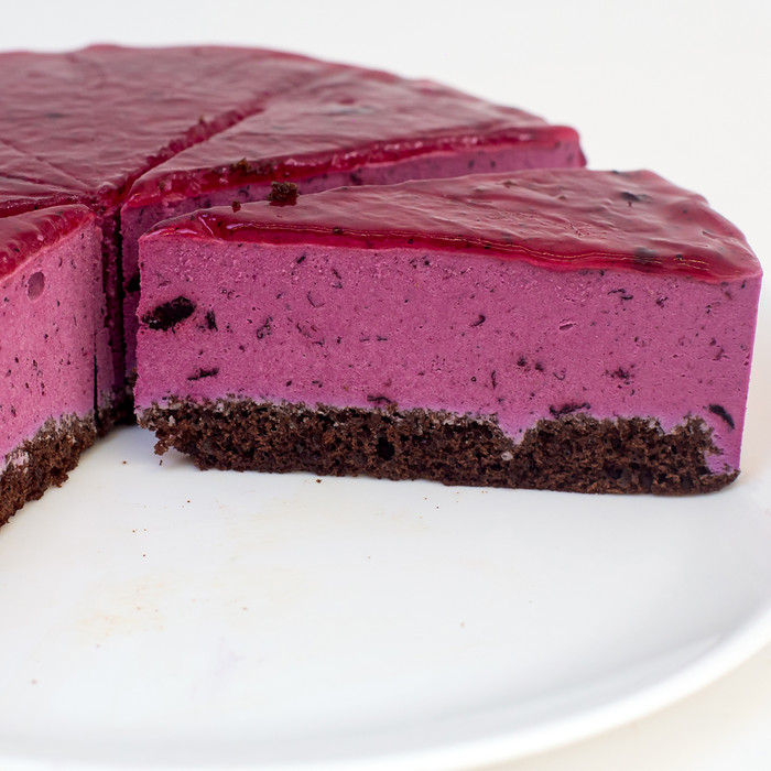 Лёгкий воздушный черничный мусс из натуральной черники, черничного йогурта и натуральных сливок на классическом шоколадном бисквите.