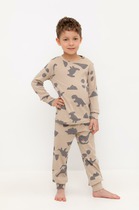 Комплект сосотоит из туники и брюк. Туника прямого силуэта, с округлой горловиной. Рукав втачной, длинный. Горловина и низ рукавов обработаны бейкой из отделочного полотна. Брюки прямые, длинные, на резинке. Низ брюк собран на резинку.