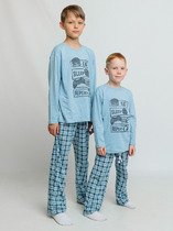 Трикотажный пижамный комплект из натурального хлопка. У джемпера длинные втачные рукава с мягкими манжетами. Брюки с удобным поясом на резинке и эластичными манжетами. Оригинальная набивка и принт выполнены из стойких, гипоаллергенных текстильных красителей. Все трикотажные полотна производятся в соответствии с нормами Швейцарского сертификата ЭкоТекс.