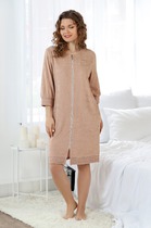 Пижама женская из гладкокрашенного трикотажного вискозного полотна, состоящая из футболки и шорт. Футболка - слегка расширенная книзу, с короткими рукавами покроя «реглан» и горловиной овальной формы. Проймы и горловина окантованы основным материалом. По срезу горловины выполнена небольшая сборка. Нижние срезы рукавов обработаны узкой обметочной строчкой. Шорты – свободного покроя, удлиненные, с эластичной тесьмой по талии.