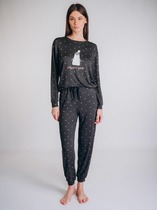Пижама из гладкокрашеного трикотажного вискозного полотна, состоящая из футболки и брюк. Футболка – с короткими втачными рукавами из кружева и горловиной овальной формы, окантованной основным материалом. На полочке – притачная кружевная кокетка v-образной формы.Брюки – классического покроя, свободные, с эластичной тесьмой по талии.