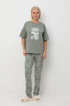 Пижама женская из гладкокрашенного вискозного полотна, состоящая из майки и шорт. Майка – слегка расширенная книзу, с углубленной горловиной овальной формы, без рукавов. Полочка с кружевными кокетками, образующими небольшой «запах». Проймы и горловина спинки окантованы основным материалом.Шорты – удлиненные, свободные, с эластичной тесьмой по талии.