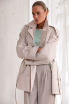 Плащ-тренчкот длинный прямого силуэта с двубортной застежкой на петли-пуговицы, втачным двух шовным рукавом и спущенной линией плеча, по низу рукавов паты с пряжкой. Воротник пиджачного типа - отложной с лацканом. Полочка с карманом-листочкой. Спинка со средним швом заканчивающимся шлицей и с отлетной кокеткой. По плечевому шву погон с застежкой на петлю-пуговицу. Тренчкот со съемным поясом с пряжкой. Плащ на подкладке.
