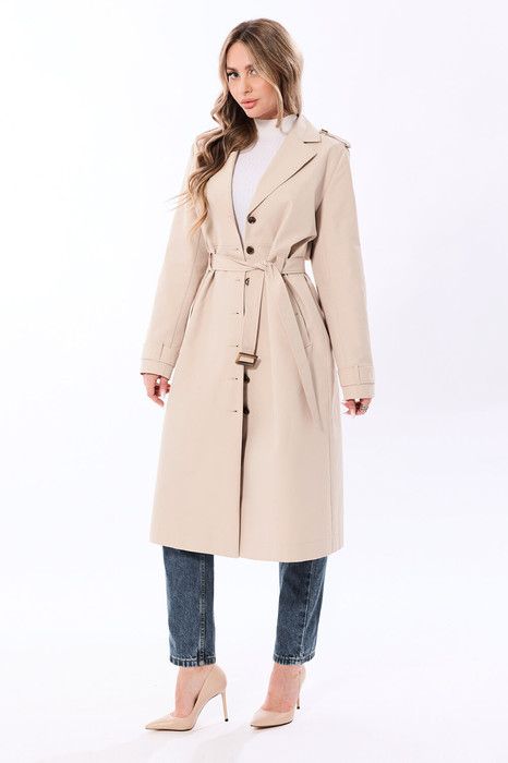 Плащ с центральной застежкой на петли и пуговицы, отложным воротником и лацканами. Плащ отрезной выше линии талии. По переду с прорезными карманами с листочками. Спинка со средним швом, заканчивающимся шлицей, отлетной кокеткой. На плечах и по низу рукавов- паты, зафиксированные шлевками и петлями с пуговицами. Рукав- втачной. Плащ со съемным поясом.