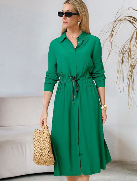 Состав: 55%Вис 45%Лиоцелл (Вис) Параметры модели на первом фото: Рост 172, бюст 88, талия 64, бедра 88Платье А-силуэта с отложным воротником как у рубашки выполнено из лиоцелла с вискозой. Лаконичная модель с потайной застежкой на пуговицы дополнена боковыми карманами и поясом-шнуром из эко-кожи.Ткань поддерживает оптимальный микроклимат, поэтому изделие подходит для любого сезона.