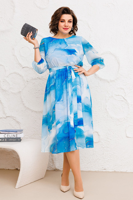 Роскошное женское платье полуприлегающего силуэта, расширенное к низу, выполнено из высококачественного шифона с модным дизайнерским принтом. Платье отрезное по талии со сборкой на резинке, полностью на трикотажной подкладке. Вырез горловины округлый, на обтачке. Рукава втачные, по низу собраны на узкую резинку. В комплект входит пояс из основной ткани. Модель платья удобная и практичная, прекрасно подойдет для ежедневной носки, а также для торжественного мероприятия.