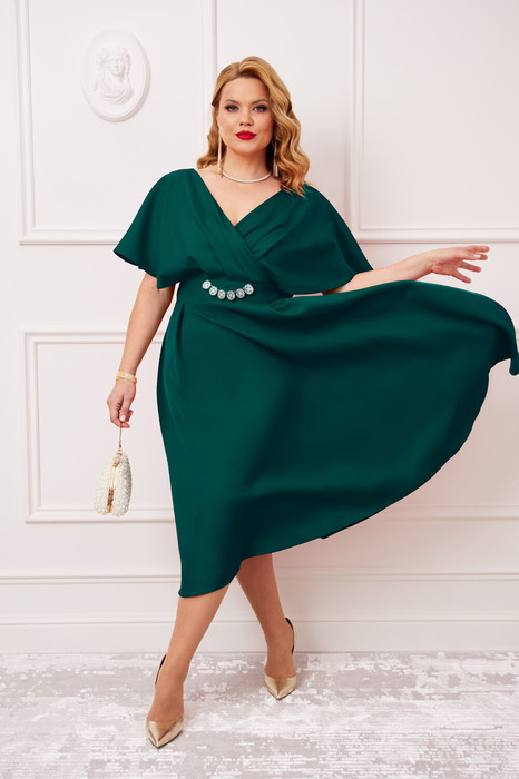 Нарядное женское платье станет отличным вариантом на любое торжество или вечеринку. Его высокий класс и стиль подчеркнут красоту каждой женщины. Элегантное платье выполнено из роскошной струящейся плательной ткани с добавлением вискозы, с V-образным вырезом горловины, отрезное по линии талии. Верхняя часть платья выполнена в свободном стиле со спущенной линией плеча и глубокими складками на линии талии, что придает ей особый стиль и шарм. Юбка платья с расклешением по переду с разрезом. В боковом шве платья потайная молния. Рукав цельнокроенный, объёмный, со спущенной линией плеча. Вставка из броши на поясе съемная.