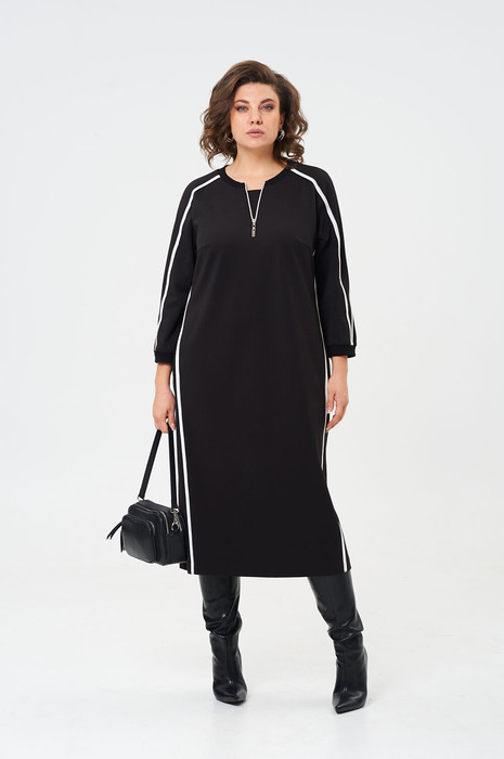 Стильное и комфортное платье из трикотажного полотна идеально подойдёт как для повседневных образов, так и для работы в офисе. Платье с контрастными кантами по рукаву реглан и по переду изделия. Вырез горловины  фигурный с декоративной молнией. По переду карманы в швах. Спинка без особенностей.