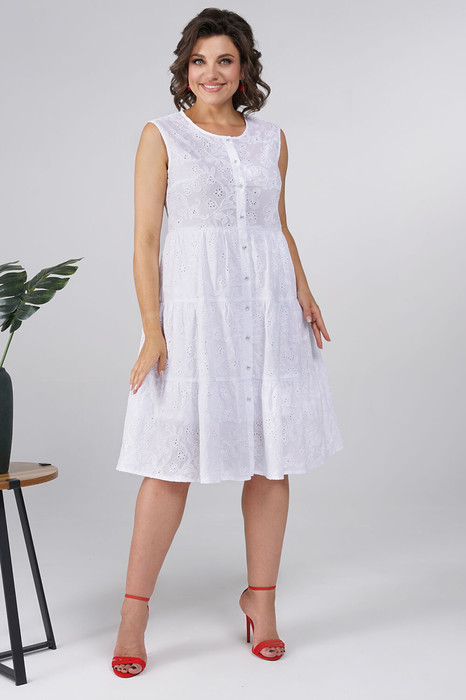 Платье  верхняя  часть полуприлегающего силуэта, нижняя из трёх воланов собранных на сборку и на подкладке, с застёжкой по плаке на петли, пуговицы, чуть спущенное плечо. Перед с нагрудными выточками. Спинка с талевыми выточками.
