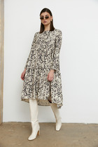 Платье женское полуприлегающего силуэта вверху с расширением книзу, отрезное по линии талии, в дополнении ремень. С застёжкой по притачной планке на петли, пуговицы. С короткими рукавами «крылышко» собраны на сборку. Воротник стояче-отложной на отрезной стойке, застёгивающейся на петлю, пуговицу.