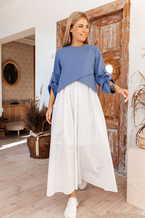 Платье макси комбинированное, двухцветное. Лиф ассиметричный по низу, с имитацией запаха, выполнен из денима. Вырез горловины полукруглый, по спинке затежка на молнию. Рукава втачные, с манжетами и патами. Юбка на резинке, драпирующаяся, расширенного силуэта. От талии на резинке.