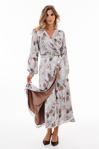 Шифоновое платье на подкладке с застежкой сзади по горловинке. Талия на резиночке. Пояс в комплекте.