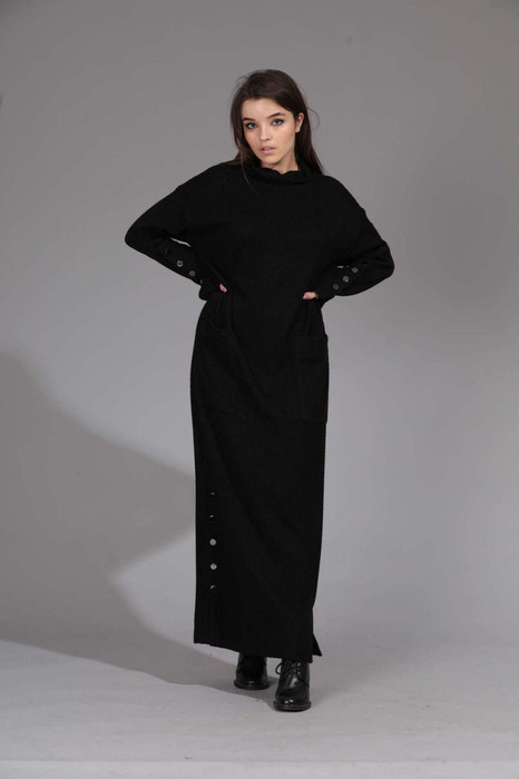 Длинное  приятное Трикотажное фактурное платье с разрезами по боковым и  функциональным декором ввиде пуговиц по ним. Рукава так же имеют разрезы и ряд функционально-декоративных пуговиц.