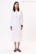 Хлопковое натуральное в полосочку. Сборка по какеткам и по валану, рубашечный воротник, застежка потайная на петли и пуговицы, в боковых швах карманы.