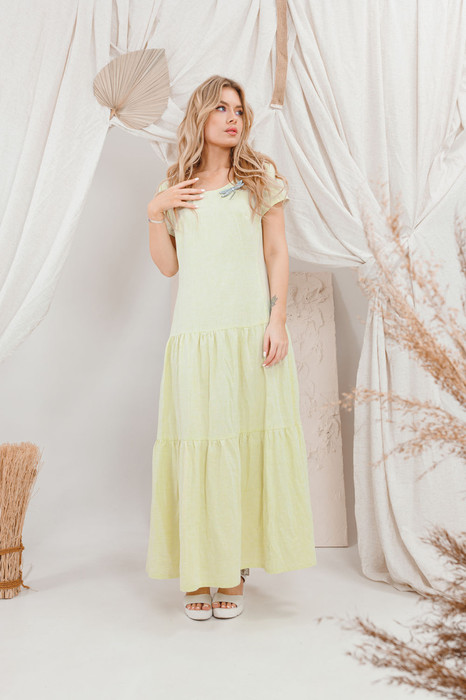 Льняное натуральное платье с двумя  воланами. На груди сьемная красивая вышивка-брошь.