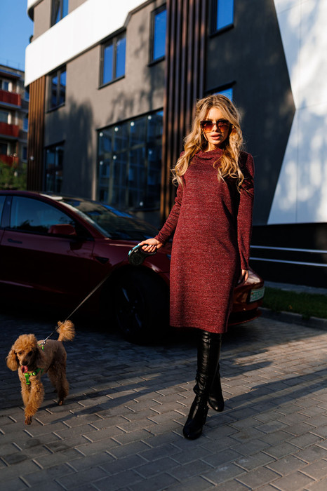 Трикотажное платье средней длины, с красивой горловинкой - стойкой. Особенно красивый трикотаж - немного меланжевый и имеет еле-заметную тончайшую люриксовую ниточку, При чем, блеск настолько мягко проигрывается, что очень мало заметен, но в то же сремя придает богатства и эффектого вида изделию. По этому платье прекрасно подойдет для любого случая в жизни.