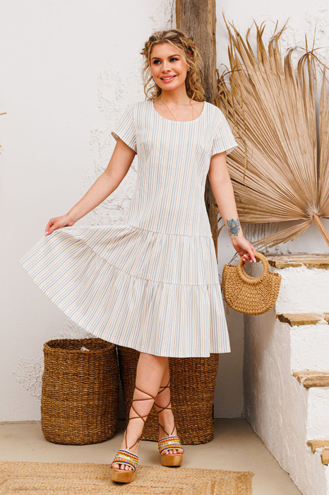 Очень красивое натуральное платье в нежную, слегка фактурную полоску. Спинка имеет средний шов, талиевые выточки и молнию.