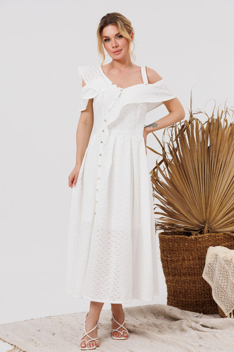 Натуральное хлопковое платье с ассиметричным видом на плечах. Ассиметричная застёжка по переду на петли и пуговицы. Платье на хлопковой подкладке.