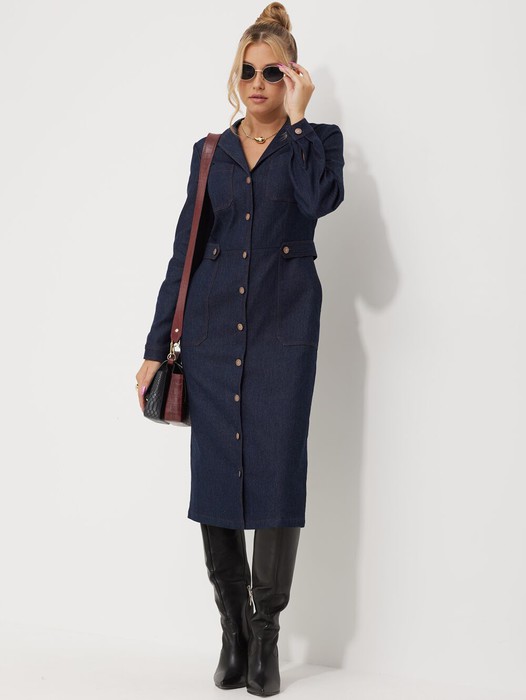 Платье женское полуприлегающего силуэта слегка зауженное к низу. Платье представлено из двух видов ткани из джинса на хлопковой основе и благородного замша. Застежка центральная на петли и пуговицы, воротник пиджачного типа. Платье отрезное по линии талии. На лифе полочки настрочены фигурные накладные карманы, на лифе и юбке обработаны талевые выточки, по юбке обработаны боковые накладные карманы. По спинке лифа обработана кокетка, также обработаны талевые выточки для более идеальной посадки. По линии талии по бокам паты, застёгивающиеся на петли и пуговицы. Рукава длинные втачные по низу притачная манжета на петлю и пуговицу.