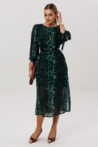 Платье женское из 2-х видов блузочной ткани (однотон и горох) прямого силуэта. По полочке идет фигурный подрез под грудью, переходящий в фигурный подрез по спинке. По юбке по подрезу идет сборка и клапаны. По полочке идут грудовые выточки из проймы. Застежка - планка на петли и пуговицы. Воротник с отрезной стойкой. По спинке - отрезная кокетка. Рукав 3/4 длины на манжете. В качестве декора -термонаклейка в верхней части полочки. Длина по спинке (верх): (50-54) - 42см, (56-60) -44см. Длина (юбкапо боку): (50-54)-75см, (56-60)-77см. Длина рукова с манжетой:(50-54)-46см, (56-60)-47см