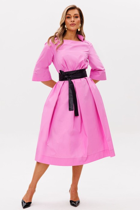 Шикарное женское платье из хлопка. Идеально на любую погоду: под босоноржки либо под сапоги и пальто. Отличный вариант универсального изделия: подойдет как для повседневного и офисного гардероба, так и для праздничного выхода. Отрезное по линии талии. По полочке объем груди создается за счет направленных складок из подреза. Объем юбки создается за счет центральной встречной и 2-х односторонних складок. По бокам в юбке- карманы. Рукав втачной, 3/4 длинны с отворотом. Вырез горловины лодочка с отложным воротником. Пояс из эко-кожи. Длина спинки до подреза -45 см., длина юбки -77см. Длина рукава-44 см.
