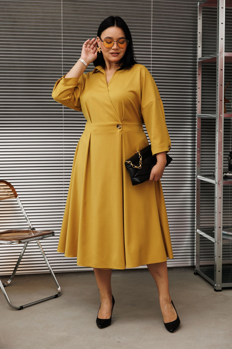 Элегантное женское палтье  из костюмной ткани необычного кроя станет изюминкой вашего гардероба.  Платье полуприлегающего силуэта, отрезное по линии талии со спущенным плечом. Рукав 3/4 длиный на отрезной манжете.  По полочке идут защипы-складки в верхней и нижней частях, запах - на петли и пуговицы по подрезу. По нижней части платья запах идет в виде складки.  По спинке кокетка со складкой, по подрезу вставлена резинка.  Юбка-полусолнце с односторонними  складками по полочке, по бокам карманы. По горловине воротник на отрезной стойке. Платье будет идеально смотреться с туфлями, ботинкаи и сапогами. Длина по спинке: 117см. Длина рукава с манжето 29см.