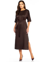 пояс-резинка из трикотажного полотна. В боковом шве обработаны карманы. Рукав втачной, одношовный, короткий. Платье длиной за колено, платье на плечиках.
