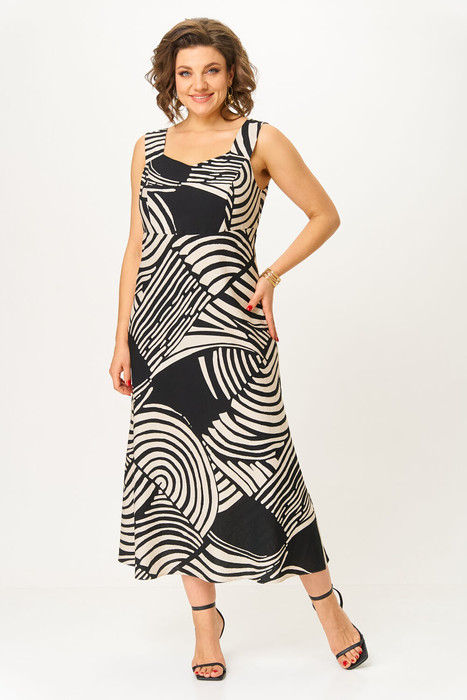 Платье прилегающего силуэта, длиной за колено. Лиф платья отрезной. Полочка лифа с вертикальными рельефами и фигурной горловиной. Спинка лифа с вертикальными рельефами. Лиф на широких бретелях, выполненных из отделочной ткани. Юбка платья скроена по косой. В левом боковом шве обработана потайная молния.