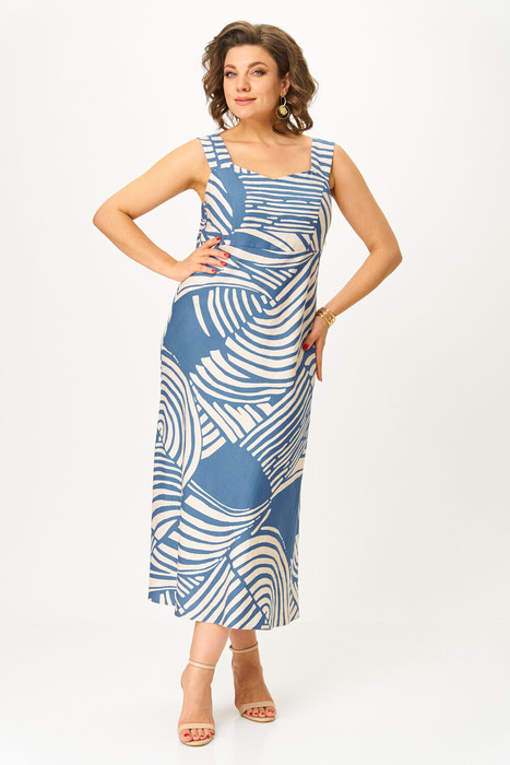 Платье прилегающего силуэта, длиной за колено. Лиф платья отрезной. Полочка лифа с вертикальными рельефами и фигурной горловиной. Спинка лифа с вертикальными рельефами. Лиф на широких бретелях, выполненных из отделочной ткани. Юбка платья скроена по косой. В левом боковом шве обработана потайная молния.