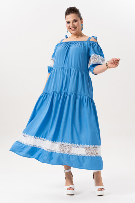 Платье из премиальной вискозы с эффектом шёлка, легкое и очень комфортное,  приятное к телу, на завязывающихся бретельках  по плечам, силуэта транеция.   С притачными воланами, со сборкой,  с боковыми карманами в швах. Рукава 3/4, со вставкой из кружева, низ рукавов на резинке. Вырез горловины с эластичной тесьмой,  что позволяет носить платье на плечах, и со спущенными плечами.