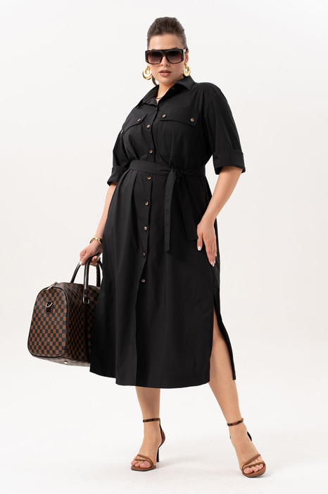 Платье  с воротником на стойке, с центральной бортовой застёжкой на петли и пуговицы, на полочке нагрудные карманы с клапанами, застёгивающиеся на петли и пуговицы, со сьёмным поясом, с  втачными рукавами 3/4.в боковых швах обработаны карманы. спинка цельная со складкой в верхней части спинки. по бокам разрезы.