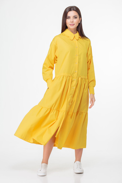 Расширенный крой, слегка заниженная талия, подчёркнута кулиской с завязывающимся поясом, втачные длинные рукава с фигурными манжетами и возможностью регулировать длину. Нижняя часть с двумя присборенными воланами. Фигурный воротник рубашечного кроя, застёжка на пуговицы до уровня талии.