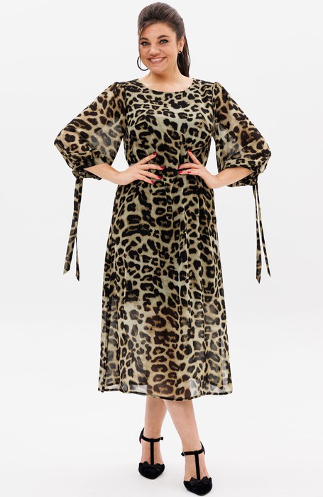Нежный шифон с оригинальным и запоминающимся принтом создаёт ощущение легкости и воздушности, что делает его незаменимым для особых случаев. Завязки на рукавах добавляют особого шарма, подчеркивая индивидуальность, а изящные разрезы вдоль юбки — смелости и элегантности вашему образу.