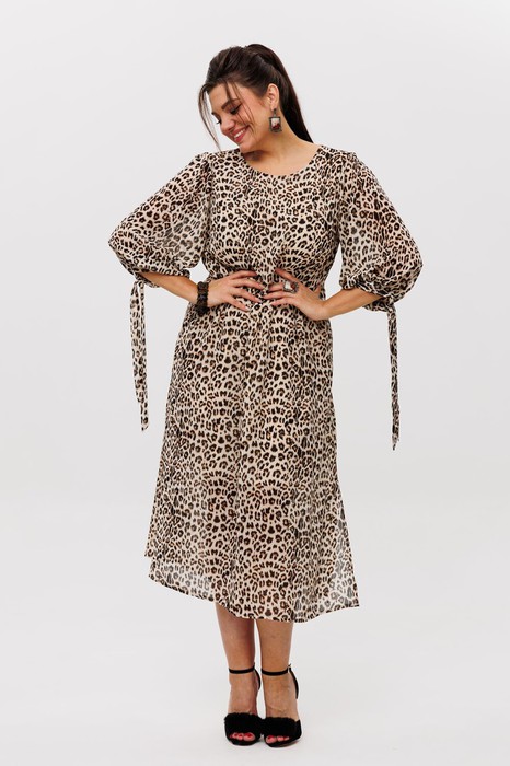 Нежный шифон с оригинальным и запоминающимся принтом создаёт ощущение легкости и воздушности, что делает его незаменимым для особых случаев. Завязки на рукавах добавляют особого шарма, подчеркивая индивидуальность, а изящные разрезы вдоль юбки — смелости и элегантности вашему образу.