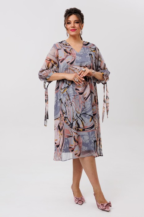 Втачной рукав три четверти мягко облегает руку, а манжеты на завязках с игривыми бантами придают образу очаровательную нежность. Шифон в цвете «танец бабочек» лёгкий и текучий, играет бликами при каждом движении.