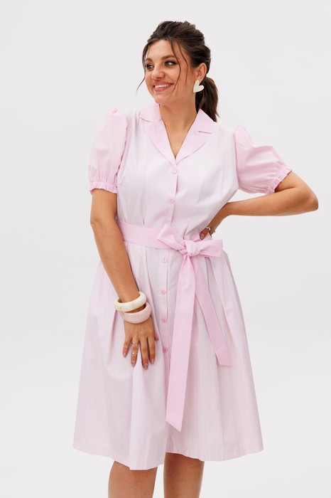 Нижняя часть платья с двумя встречными складками по переду и спинке от линии талии создаёт красивое движение ткани при каждом шаге, добавляя образу воздушности и деликатного объёма. Хлопковая ткань в мелкую полоску выглядит свежо и утончённо, а детали из ткани-компаньона в такую же мелкую клеточку - втачной короткий рукав-фонарик, отложной воротник с лацканами и съёмный завязывающийся пояс - придают образу особое очарование и делают его по-настоящему выразительным.