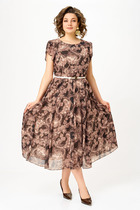 Платье из легкой ткани Шифон,  отрезное по линии талии. Округлый воротник-стойка. Застежка молния в боковом шве. Дополнено съемным поясом. Рукава реглан.  Длина платья: 110 Длина рукава: 47 см. Полуобхват талии – 49 см.
