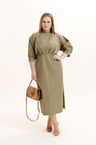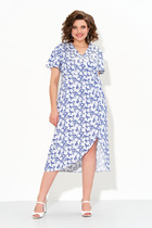 Платье полуприлегающего силуэта, отрезное по линии талии, вырез горловины V-образный, втачной рукав, нижняя часть платья впереди с запахом.