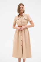 Нижняя часть - платье А-силуэта, расклешенное книзу, длиной до середины икры. Горловина округлой формы. По переду - нагрудные вытачки. По спинке - средний шов.