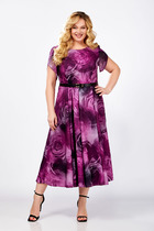 Платье приталенного силуэта, чуть ниже колена из костюмно-плательной ткани. Вырез горловины квадратной формы. Отрезное по линии талии. Перед и спинка с рельефами. По спинке средний шов, в котором вставлена потайная молния, внизу разрез. Рукав втачной широкий длинный, по окату собран на резинку. Длинный рукав легко превратить в три четверти с помощью резинки, вставленной по низу рукава. В комплект входит пояс из основной ткани.