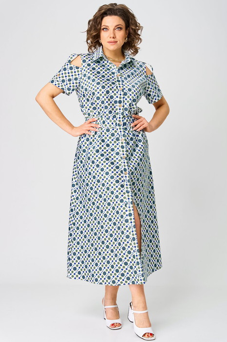 Платье полуприлегающего силуэта, расклешенное книзу. Воротник отложной, на притачной стойке. Платье отрезное по линии талии, на широкой резинке. Платье с центральной застежкой на петли и пуговицы на притачных планках. Полочка с нагрудными вытачками. В боковых швах юбки функциональные карманы. Рукав втачной короткий, с открытым плечом и декоративной патой на пуговице, понизу - притачная манжета.