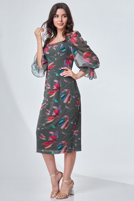 Платье приталенного силуэта, на подкладке. Вырез горловины квадратной формы. Отрезное по линии талии. Перед и спинка с рельефами. По спинке средний шов, в котором вставлена потайная молния, внизу разрез. Рукав втачной длиной 3/4, по окату присборен на резинку, в нижней части рукава сборка на венгерку.