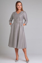 Платье полуприлегающего силуэта, отрезное по линии талии. Горловина с фигурным вырезом, обработана обтачкой. По переду лифа - рельефные швы. По спинке лифа талиевые вытачки и средний шов, в котором обработана потайная молния. Юбка платья "клеш". Рукав втачной прямой, длиной 3/4. В комплекте к платью прилагается съемный пояс.