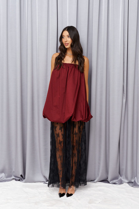 Платье-баллон выполнено из хлопкового полотна бордового цвета. Характеристики: верх на резинке со сборкой, подкладка. Длина изделия 57 см.