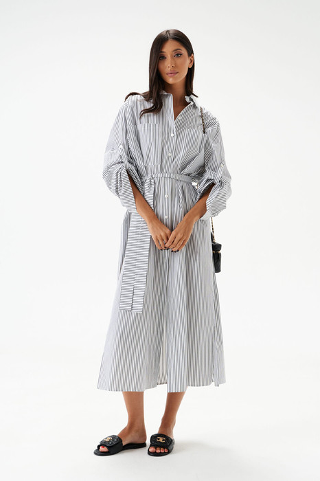 Платье свободного прямого кроя. Характеристики: отложной воротник, застежка центральная на петли пуговицы, талия фиксируется поясом из основной ткани изделия, по переду нашиты функциаональные карманы. Рукав свободного кроя с пуговичкой по середине и скрытым элементом для удержания рукава при сборке. Спинка отрезная. Длина по спинке 130см.